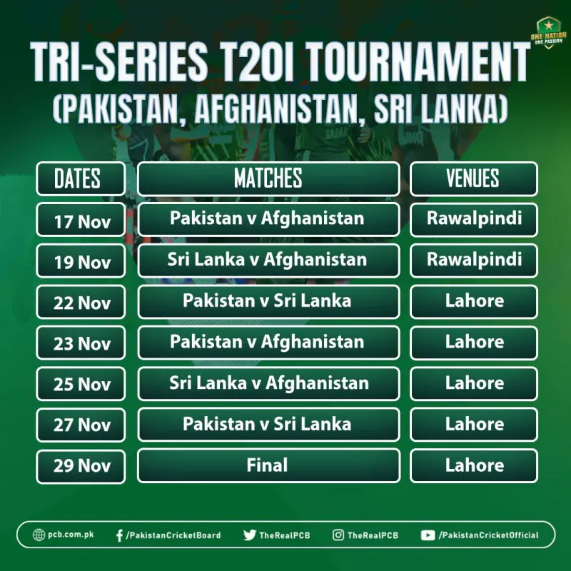 ذرائع کے مطابق ٹرائی سیریز 17 سے 29 نومبر تک راولپنڈی اور لاہور میں ہو گی۔