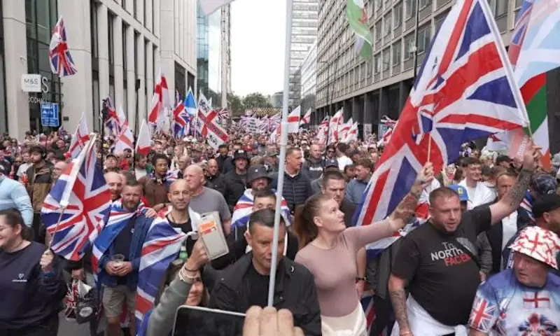 وسطی لندن میں ہفتے کو 1 لاکھ سے زائد مظاہرین نے برطانیہ میں دائیں بازو کے رہنما ٹومی رابنسن کے زیرِ اہتمام ”یونائیٹ دی کنگڈم“ مارچ کیا جسے لندن کا اب تک کا سب بڑا مظاہرہ قرار دیا گیا ہے۔
