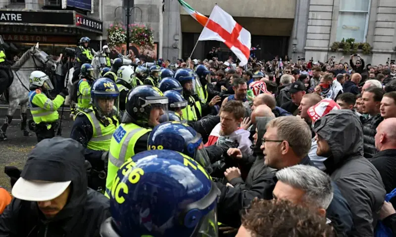 احتجاج کے دوران ہزاروں مظاہرین برطانیہ کے جھنڈے اٹھائے ہوئے تھے جس دوران پولیس کے ساتھ جھڑپیں بھی پیش آئیں۔