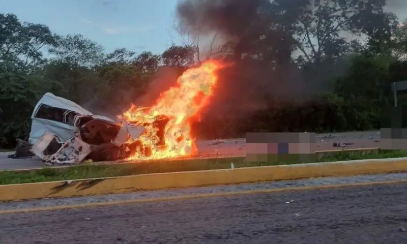 رپورٹ کے مطابق حادثہ میکسیکو کے شہر میریڈا اور کیمپ چے کے درمیان ہائی وے پر ٹریلر، کار اور ٹیکسی کی ٹکر کے باعث پیش آیا۔ ٹکر اتنی شدید تھی کہ ٹرک آگ کے گولے میں تبدیل ہو گیا، جس میں 14 افراد بشمول ڈرائیور زندہ جل گئے یا کچلے گئے۔