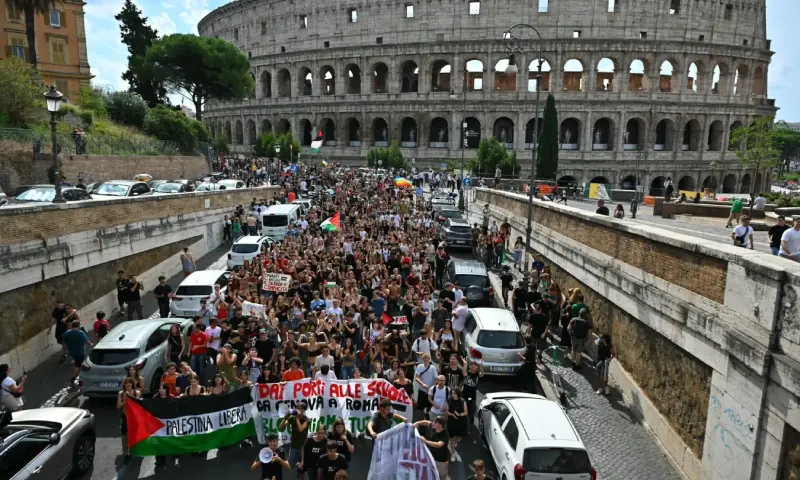 روم میں ہزاروں افراد نے ریلوے اسٹیشن کے باہر جمع ہو کر مارچ شروع کیا، جس سے ایک مرکزی رنگ روڈ بند ہو گئی۔ مظاہرین نے پلے کارڈز اٹھا رکھے تھے جن پر ”فلسطین آزاد کرو“، ”سب کچھ بند کرو“ کے نعرے درج تھے۔