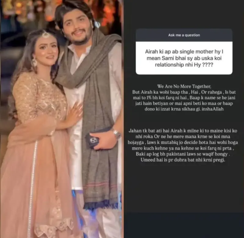 ”میں اور سمیع اب ساتھ نہیں ہیں، لیکن ایرہ کا باپ ہمیشہ سمیع ہی رہے گا۔ بیٹیاں اپنے والد کے نام سے پہچانی جاتی ہیں اور میں اپنی بیٹی کو والد اور والدہ دونوں کی عزت کرنا سکھاؤں گی۔“