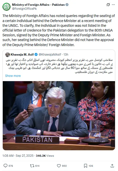 دفتر خارجہ نے وضاحت جاری کرتے ہوئے کہا کہ ’متعلقہ خاتون کا نام پاکستان کے وفد کے لیے 80ویں جنرل اسمبلی اجلاس کے اس سرٹیفکیٹ (Letter of Credence) میں شامل نہیں تھا، جس پر نائب وزیر اعظم و وزیر خارجہ نے دستخط کیے تھے۔ لہٰذا وزیر دفاع کے پیچھے ان کی نشست کو نائب وزیر اعظم و وزیر خارجہ کی منظوری حاصل نہیں تھی۔‘