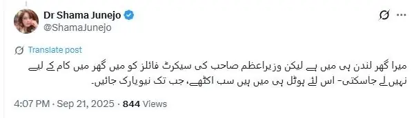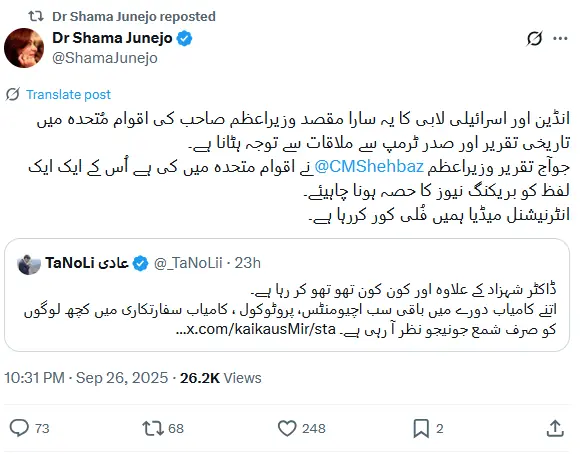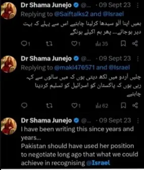 ڈاکٹر شمع جونیجو نے خود پر ہونے والی تنقید کا جواب دیتے ہوئے لکھا کہ ’انڈین اور اسرائیلی لابی کا یہ سارا مقصد وزیراعظم صاحب کی اقوام متحدہ میں تاریخی تقریر اور صدر ٹرمپ سے ملاقات سے توجہ ہٹانا ہے‘۔