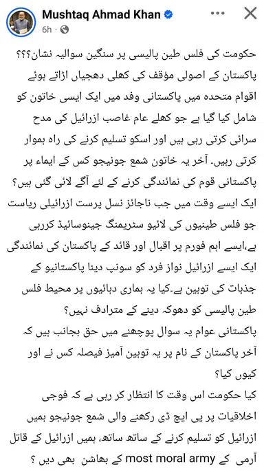 سابق سینیٹر مشتاق احمد خان نے تنقید کرتے ہوئے لکھا کہ ’پاکستان کی نمائندگی اسرائیل نواز فرد کو سونپ دینا پاکستانیوں کی توہین ہے‘۔