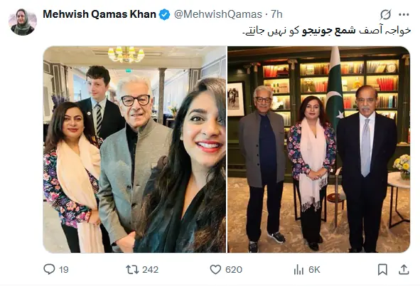 خاتون صحافی مہوش قماس خان نے وزیر دفاع کے اظہار لاعلمی پر شمع جونیجو کے ساتھ ان کی تصویر شیئر کرتے ہوئے اپنی طنزیہ پوسٹ میں لکھا، ’خواجہ آصف شمع جونیجو کو نہیں جانتے‘۔