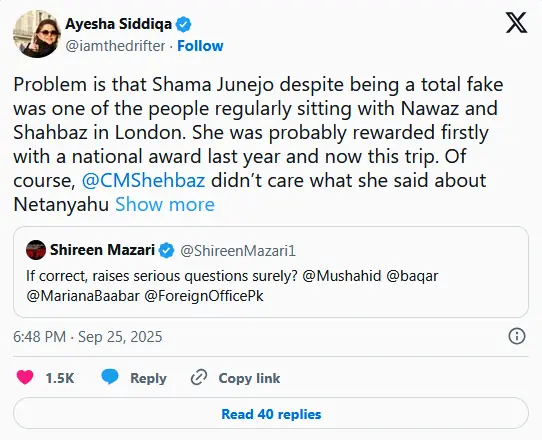 کاتون صحافی عائشہ صدیقہ نے لکھا کہ ’وزیراعظم شہباز شریف کو کوئی فرق نہیں پڑتا کہ وہ (شمع جونیجو) نیتن یاہو کے بارے میں کیا کہتی ہیں‘۔