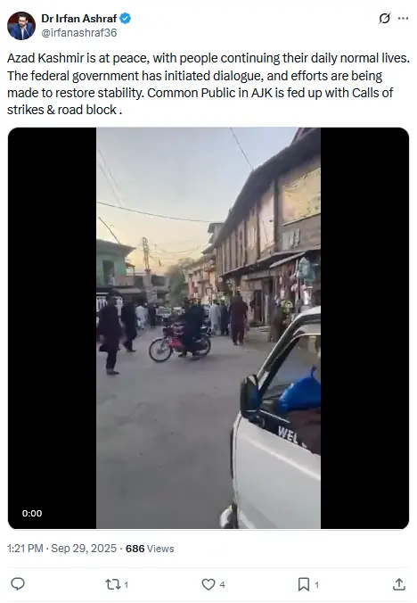 دوسری جانب آزاد کشمیر حکومت کے ترجمان ڈاکٹر عرفان اشرف کا کہنا ہے کہ آزاد کشمیر پُرامن ہے اور لوگ اپنے معمولاتِ زندگی میں مشغول ہیں۔