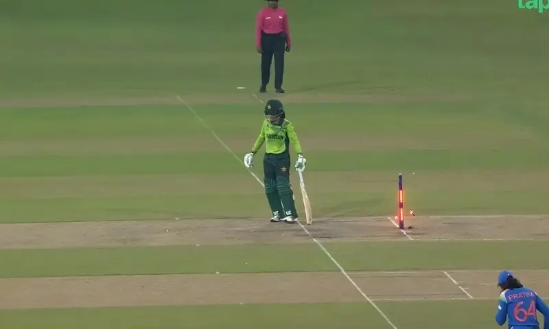 اسی دوران منیبہ علی نے چند لمحوں کے لیے کریز سے باہر نکل آئیں اور اپنا بیٹ زمین سے اٹھا لیا تب ہی دیپتی شرما کی ایک تیز تھرو سیدھا اسٹمپ پر جاکر لگی جس کے بعد انہیں رن آؤٹ دے کر امپائر نے فیصلہ بھارت کے حق میں دیا، جس پر تنازع شدت اختیار کر گیا اور پاکستانی کپتان نے فوری طور پر امپائرز سے اس پر بات کی۔