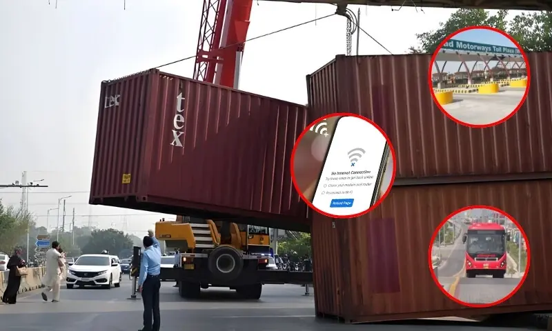 جمعے کو اسلا آباد اور راولپنڈی ایک بار پھر کنٹینر کا شہر بن گیا، مذہبی جماعت کے احتجاج اور سیکیورٹی خدشات کے باعث سڑکیں بند، انٹرنیٹ سروس معطل اور موبائل سروس کی جزوی بندش ہے، میٹرو بس سمیت شہر کی دیگر گاڑیاں بھی سڑکوں پر نہیں آئیں، موٹروے پر بھی ٹریفک معطل ہے جس کے باعث شہریوں کو شدید مشکلات کا سامنا ہے وہی موٹر سائیکل والے بھی راستے تلاش کرتے رہے۔