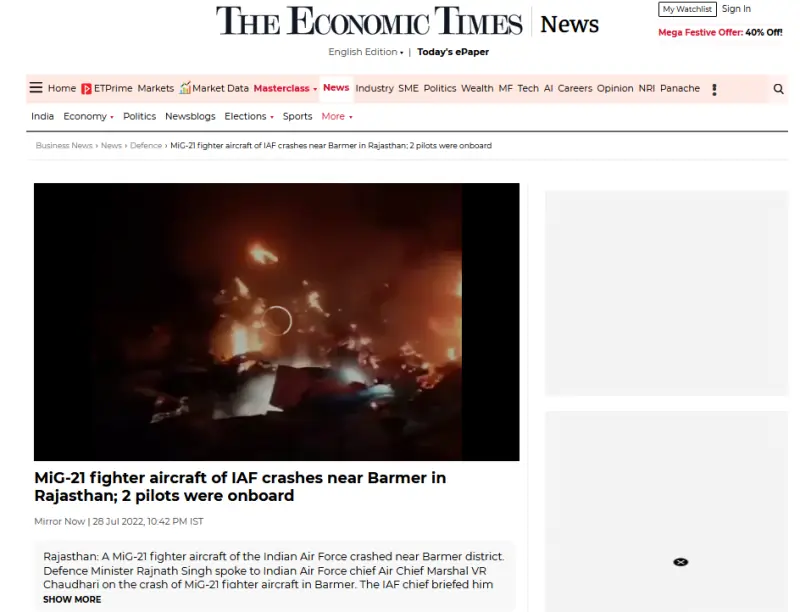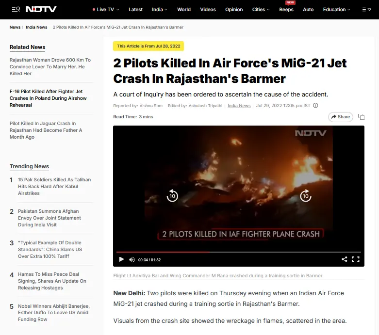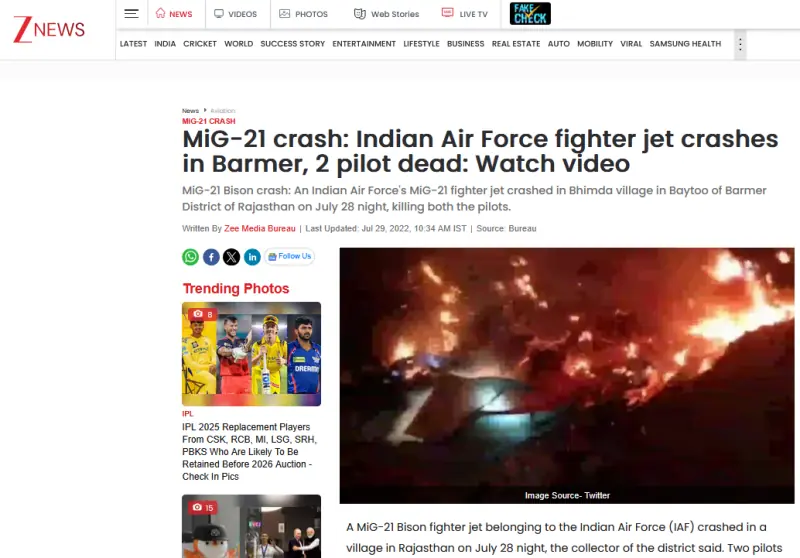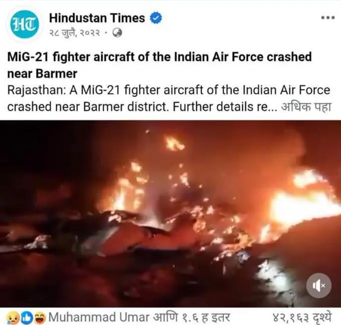 ویڈیو میں دکھایا گیا تباہ شدہ طیارہ دراصل بھارت کا مگ-21 ٹو سیٹر فائٹر جیٹ ہے جو 28 جولائی 2022 کو بھارتی ریاست راجستھان کے ضلع بارمیر میں حادثے کا شکار ہوا تھا۔ اس حادثے میں بھارتی فضائیہ کے دو پائلٹس بھی مارے گئے تھے۔