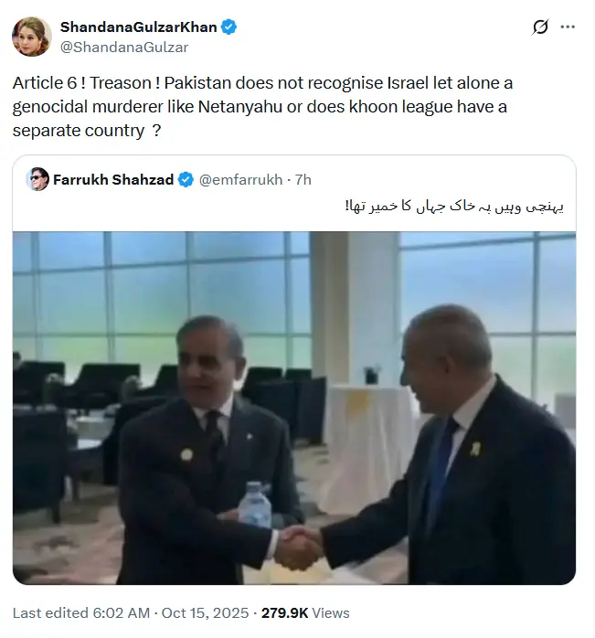 شندانہ گلزار نے سوشل میڈیا پلیٹ فارم ایکس پر ایک پوسٹ شئیر کرتے ہوئے لکھا: ’آرٹیکل 6! غداری! پاکستان اسرائیل کو تسلیم نہیں کرتا، نیتن یاہو جیسے قاتل سے ملاقات ناقابلِ قبول ہے یا کیا خون لیگ نے الگ ملک بنا لیا ہے؟‘