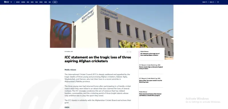 واضح رہے کہ انٹرنیشنل کرکٹ کونسل (آئی سی سی) نے 18 اکتوبر کو جاری ایک بیان میں کہا تھا کہ افغانستان کے صوبہ پکتیکا میں ہونے والے فضائی حملے میں تین افغان کرکٹرز مارے گئے۔ آئی سی سی نے ان مبینہ اموات پر گہرے دکھ اور افسوس کا اظہار کیا تھا۔