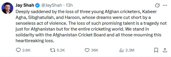 وزیر اطلاعات نے افسوس ظاہر کیا کہ آئی سی سی کے بیان کے فوراً بعد اس کے چیئرمین جے شاہ نے، جو بھارتی کرکٹ بورڈ کے سیکریٹری بھی ہیں، سماجی رابطے کی ویب سائٹ ”ایکس“ پر اسی دعوے کو دہرایا، جس کے بعد افغان کرکٹ بورڈ نے بھی عین اسی طرز پر ایک بیان جاری کیا۔