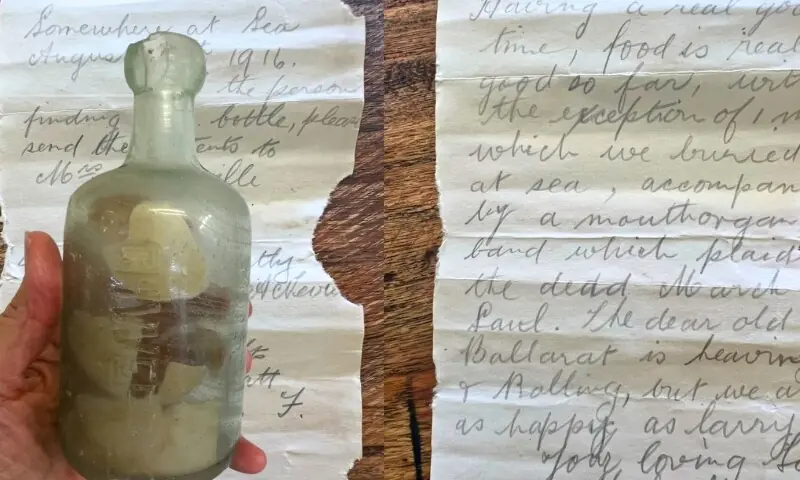 آسٹریلیا کے ایک ساحل پر سو سال سے زائد پرانی بوتل ملی جس میں پہلی عالمی جنگ کے دو آسٹریلوی فوجیوں کے ہاتھ سے لکھے پیغامات محفوظ تھے۔ بوتل ایک خاندان کو ساحل کی صفائی کے دوران ملی، جس نے دونوں فوجیوں کے لواحقین کو اطلاع دی۔