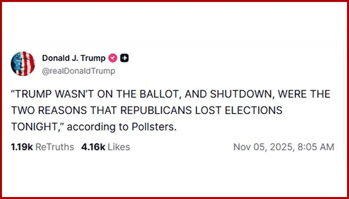 الیکشن نتائج سامنے آنے کے بعد ڈونلڈ ٹرمپ نے اپنی سوشل میڈیا سائٹ ”ٹروتھ سوشل“ پر ایک پوسٹ میں کہا کہ ریپبلکن امیدوار کی شکست کی دو بڑی وجوہات ہیں۔ پہلی وجہ یہ کہ وہ خود بیلٹ پر موجود نہیں تھے، جس سے ووٹرز میں جوش کم رہا۔ دوسری وجہ، ان کے مطابق، امریکا میں جاری حکومتی شٹ ڈاؤن ہے، جس نے عوامی اعتماد کو متاثر کیا۔