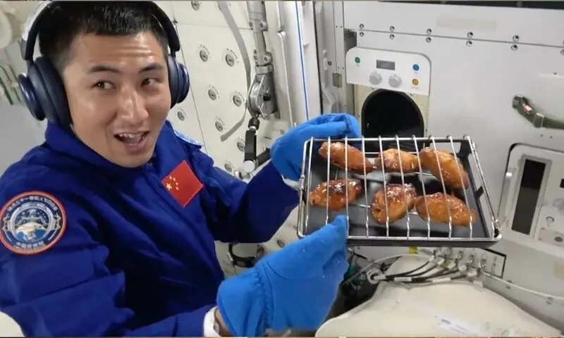 ویڈیو میں دیکھا جا سکتا ہے کہ خلا باز چکن ونگز کو خصوصی گرل کیج میں رکھ کر اسپیس اسٹیشن کی دیوار میں نصب چھوٹے کابینیٹ نما اوون میں ڈال رہے ہیں۔