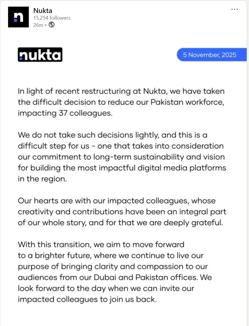 واضح رہے کہ معروف اینکر پرسن کامران خان کے ڈیجیٹل میڈیا پراجیکٹ ’نکتہ‘ کی انتظامیہ نے حال ہی میں 37 ملازمین کو بغیر کسی پیشگی اطلاع کے فارغ کر دیا تھا۔