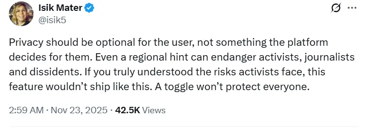اوپن سورس انٹیلی جنس مانیٹرنگ اکاؤنٹ ’او ایس انٹیل ڈیفینڈر‘ نے لکھا کہ ”آج ایکس پر بہت سے بڑے اکاؤنٹس کے لیے دن بہت مشکل رہا۔ خاص طور پر وہ اکاؤنٹس جو MAGA، پرو-روسی، پرو-چینی، پرو-ایرانی، پرو-اسرائیلی، اور کرپٹو کمیونٹیز سے تعلق رکھتے ہیں، کیونکہ ایکس نے اب اکاؤنٹس کی لوکیشن کی معلومات دکھانا شروع کر دی ہے۔“