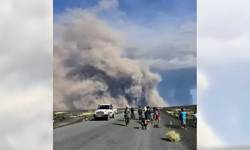 ایتھوپیا میں دارالحکومت ادیس ابابا سے تقریباً 800 کلومیٹر دور افار ریجن میں 12 ہزار سال سےخاموش ہیلی گُبی آتش فشاں پھٹنے کے بعد اس سے نکلنے والی راکھ اور سلفر ڈائی آکسائیڈ کے بادل 46 ہزار فُٹ کی بلندی تک پہنچ گیا۔