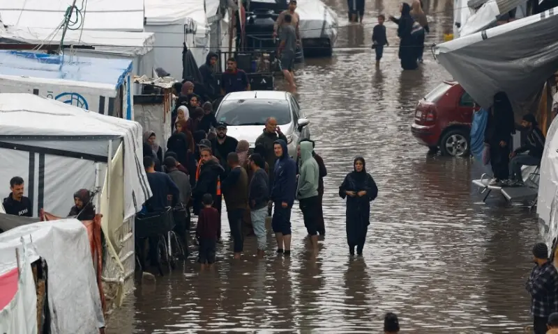 برطانوی خبر رساں ادارے ’رائٹرز‘ کے مطابق غزہ پٹی میں منگل کے روز موسلا دھار بارش اور سیلابی صورت حال کے باعث ہزاروں بے گھر فلسطینیوں کے خیمے پانی میں ڈوب گئے۔ مقامی حکام کے مطابق خیمہ بستیوں میں رہنے والے لوگ پہلے ہی سخت سردیوں اور ناکافی پناہ گاہوں کے باعث مشکلات کا شکار ہیں جب کہ حالیہ بارشوں نے صورتحال مزید خراب کر دی ہے۔