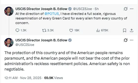 امریکا میں حالیہ واقعات نے ایک بار پھر امیگریشن پالیسیوں اور قومی سلامتی کے درمیان توازن کے سوال کو نمایاں کر دیا ہے۔ واشنگٹن میں نیشنل گارڈ کے دو اہلکاروں پر فائرنگ کے بعد صدر ڈونلڈ ٹرمپ نے نہ صرف بائیڈن دور میں منظور ہونے والی پناہ گزین درخواستوں کا جائزہ شروع کروایا ہے بلکہ اُن 19 ممالک کے شہریوں کو جاری کیے گئے گرین کارڈز کا بھی ازسرِ نو معائنہ کرنے کا حکم دیا ہے جنہیں واشنگٹن انتظامیہ طویل عرصے سے سکیورٹی خدشات کے تناظر میں ہائی رسک سمجھتی رہی ہے۔