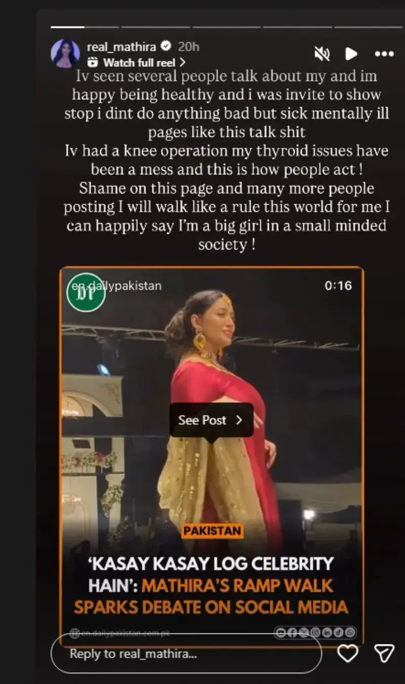 پاکستان کی معروف ماڈل، اداکارہ اور ٹی وی میزبان متھیرا نے حال ہی میں ایک فیشن شو میں اپنی ریمپ واک پر ہونے والی تنقید کا بھرپور جواب دیا ہے۔
