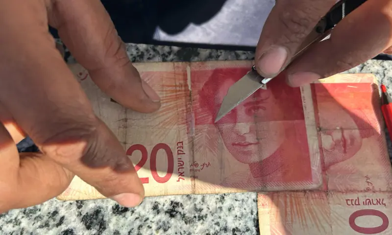 غزہ شہر کے ایک مصروف بازار میں اسرائیل کرنسی (100 شیکل) کا بوسیدہ اور پیلا نوٹ، جو اب بمشکل قابلِ استعمال رہ گیا ہے، غزہ کا نوجوان مہارت کے ساتھ اسے جوڑ کر روزگار کما رہا ہے۔