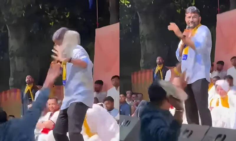 بھارتی سیاسی رہنما کو تقریر کے دوران شہری نے جوتا دے مارا