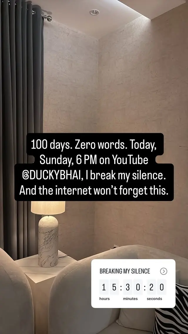 انہوں نے لکھا، ”100 دن. صفر الفاظ. آج، اتوار، 6 بجے یوٹیوب پر @DUCKYBHAI، میں اپنی خاموشی توڑ رہا ہوں۔ اور انٹرنیٹ اسے نہیں بھولے گا۔“
