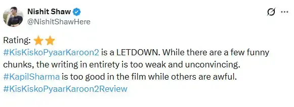 ایک صارف نے کہا، ”کس کس کو پیار کروں 2 بہت ہی بے زار مووی ہے۔ پرانی کہانی کو دوبارہ پیش کیا گیا ہے۔“