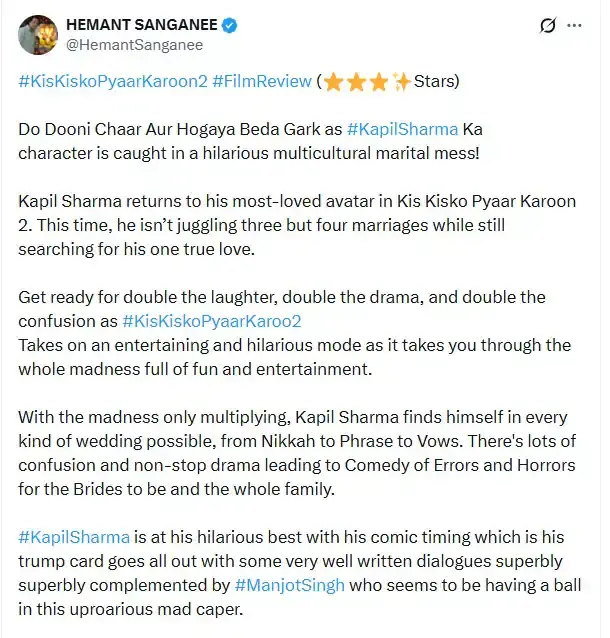 ایک اور صارف نے رائے دیتے ہوئے کہا، ”فلم میں کچھ بھی نیا پن نہیں ہے، بس نام بدل کر سیکوئل بنا دیا ہے۔کپل شرما کی اداکاری فلم میں بہت اچھی ہے، لیکن باقی ادکاروں کی اداکاری نے بہت زیادہ مایوس کیا ہے۔“