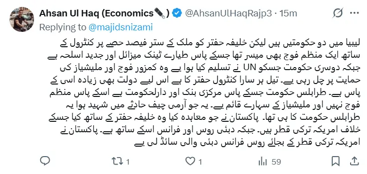 ماہر معیشت احسان الحق نے اس معاملے پر مزید روشنی ڈالتے ہوئے سجامی رابطے کی سائٹ ’ایکس‘ پر لکھا کہ ”لیبیا میں دو حکومتیں ہیں لیکن خلیفہ حفتر کو ملک کے ستر فیصد حصے پر کنٹرول کے ساتھ ایک منظم فوج بھی میسر ہے، جس کے پاس طیارے، ٹینک، میزائل اور جدید اسلحہ ہے۔ جبکہ دوسری حکومت جس کو یو این نے تسلیم کیا ہوا ہے، وہ کمزور فوج اور ملیشیاز کی حمایت پر چل رہی ہے“۔