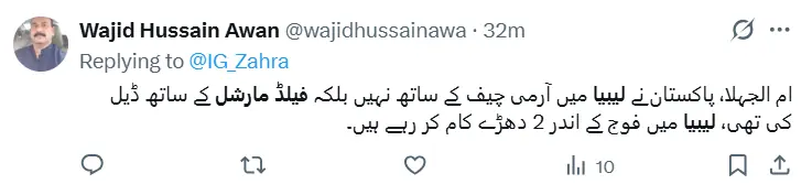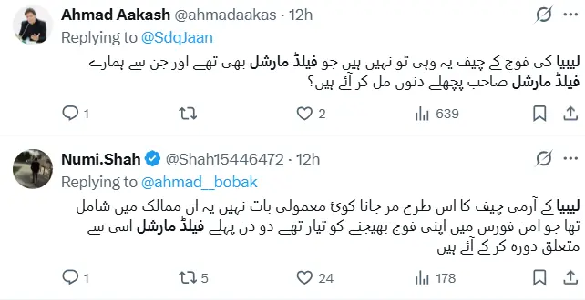 فیلڈ مارشل عاصم منیر نے حال ہی میں لیبیا کا دورہ کیا تھا جہاں انہوں نے بن غازی میں لیبیا نیشنل آرمی کے نائب سربراہ صدام خلیفہ حفتر سے ملاقات کی تھی۔
