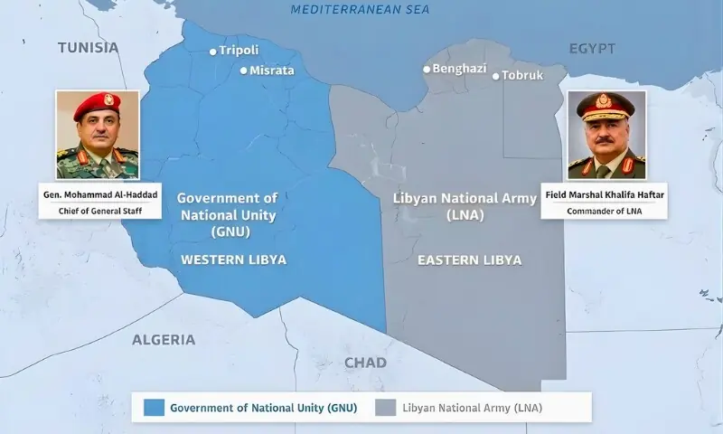 مشرق میں بن غازی سے ’حکومت برائے قومی استحکام’ انتظام سنبھالتی ہے جس کی قیادت وزیراعظم اسامہ حماد کرتے ہیں۔ جبکہ طرابلس میں عالمی سطح پر تسلیم شدہ ‘حکومت برائے قومی اتحاد‘ (جی این یو) قائم ہے جس کے وزیراعظم عبدالحمید دبیبہ ہیں۔