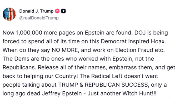 صدر ٹرمپ نے اپنے سوشل میڈیا پلیٹ فارم ٹروتھ سوشل پر ایک بیان میں لکھا کہ ڈیموکریٹس ہی وہ لوگ ہیں جو ایپسٹین کے ساتھ کام کرتے تھے، ریپبلکنز نہیں۔ ان کے تمام نام جاری کریں، ان کو شرمندہ کریں اور ملک کی خدمت کی طرف واپس جائیں۔