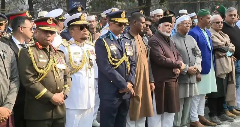 بنگلادیش کے چیف ایڈوائزر محمد یونس بھی جنازہ گاہ میں موجود تھے، جبکہ پاکستان کی نمائندگی اسپیکر قومی اسمبلی ایاز صادق نے کی، جو پاکستان کی جانب سے تعزیت اور یکجہتی کے اظہار کے طور پر شریک ہوئے۔