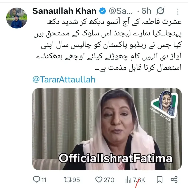 عشرت فاطمہ کے ویڈیو بیان کے بعد سوشل میڈیا پر ان کے حق میں آوازیں بلند ہونا شروع ہو گئیں۔ معروف صحافی ثناءاللہ خان نے بھی ایک پیغام میں اشرت فاطمہ کے آنسوؤں کو دیکھ کر افسوس کا اظہار کرتے ہوئے ریڈیو پاکستان کے رویے کو قابلِ مذمت قرار دیا اور ادارے پر سخت تنقید کی۔
