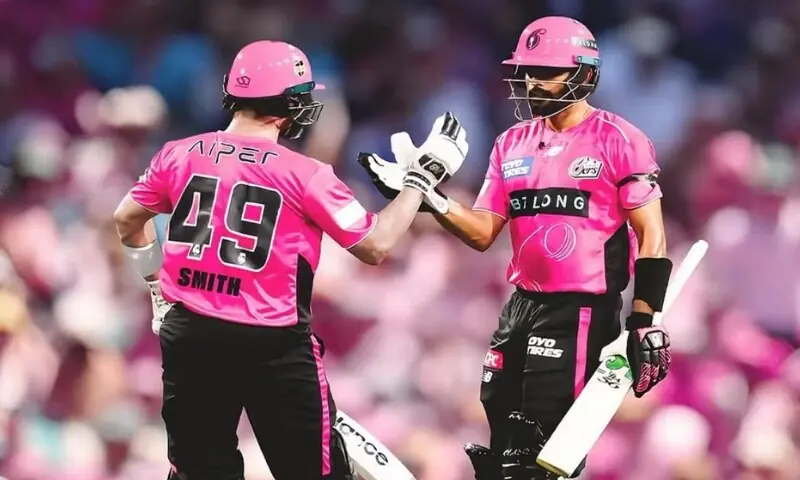 آسٹریلیا کی بگ بیش لیگ ٹی 20 میں سڈنی سکسرز کے بیٹر اسٹیو اسمتھ اور بابر اعظم نے شاندار 141 رنز کی شراکت قائم کرکے اپنی ٹیم کو سڈنی تھنڈر کے خلاف کامیابی دلوادی۔ تاہم میچ کے دوران پاکستانی اسٹار بابر اعظم اوور کی آخری گیند پر ساتھی بیٹر اسٹیو اسمتھ کے سنگل لینے سے انکار پر ناخوش دکھائی دیے۔