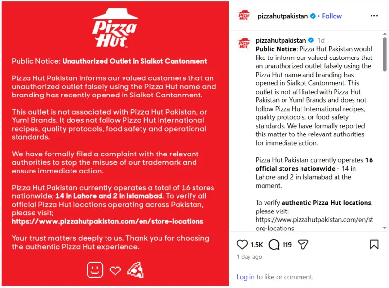 بیان میں یہ بھی کہا گیا کہ مذکورہ آؤٹ لیٹ پیزا ہٹ کے بین الاقوامی معیار، ترکیبوں، فوڈ سیفٹی اور آپریشنل اصولوں پر عمل نہیں کرتا۔