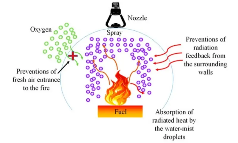 اس طریقے کا استعمال آگ کو طبیعی طور پر ٹھنڈا کرنے کے لیے کیا جاتا ہے۔ یہ سسٹم پانی کو انتہائی باریک قطروں (دُھند) میں بدل دیتا ہے جو آگ کو چاروں طرف سے گھیر لیتی ہے اور اسے ٹھنڈا کر دیتی ہے۔