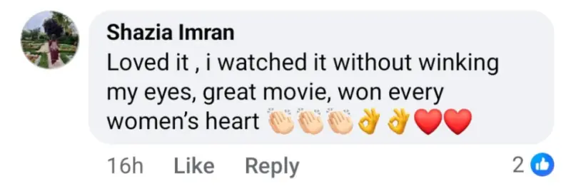 سوشل میڈیا پر ایک ناظر نے لکھا کہ فلم اتنی دل گرفتہ تھی کہ پلک جھپکنے کا موقع نہیں ملا اور یہ ہر عورت کے دل کو چھو لینے والی کہانی ہے۔
