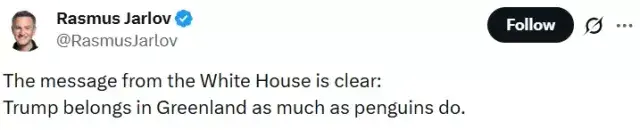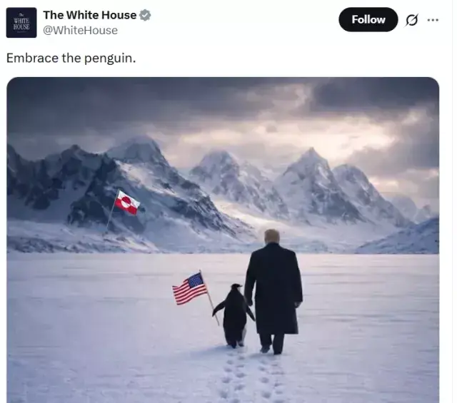 تصویر میں پینگوئن امریکی پرچم تھامے تھا اور دور گرین لینڈ کا جھنڈا نظر آ رہا تھا، ساتھ کیپشن تھا: ”Embrace the Penguin“۔