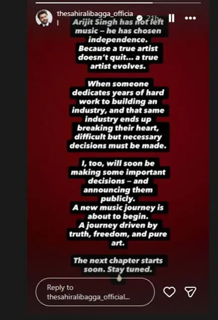 انسٹا اسٹوری میں ساحر علی بگا نے لکھا، ’اریجیت سنگھ نے موسیقی نہیں چھوڑی بلکہ انہوں نے آزادی کا انتخاب کیا۔ ایک سچا فنکار کبھی دستبردار نہیں ہوتا بلکہ آہستہ آہستہ بہتری کی طرف بڑھتا ہے۔‘