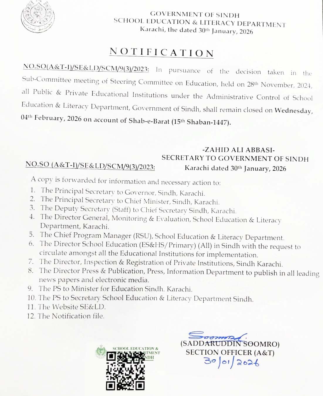 سندھ حکومت نے شب برات کے موقع پر سندھ کے تعلیمی اداروں میں 4 فروری کو تعطیل کا اعلان کردیا، جس کا نوٹیفکیشن جاری کردیا گیا ہے۔