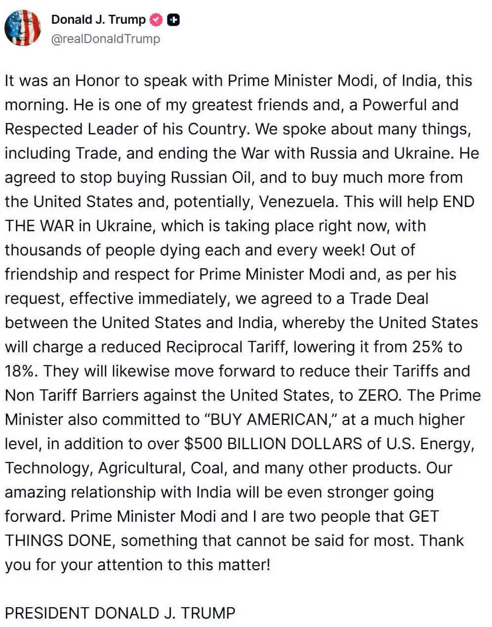 مودی نے سوشل میڈیا پر اس اعلان کا خیرمقدم کرتے ہوئے کہا کہ وہ صدر ٹرمپ سے بات چیت پر خوش ہیں اور بھارتی مصنوعات پر ٹیرف میں کمی کے اعلان پر انہوں نے صدر ٹرمپ کا شکریہ ادا کیا، تاہم انہوں نے روسی تیل خریدنا بند کرنے کے وعدے کا براہِ راست ذکر نہیں کیا۔
