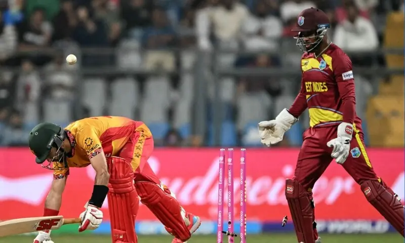 ممبئی کے وانکھڈے اسٹیڈیم میں جاری ٹی 20 ورلڈ کپ کے 44 ویں میچ میں زمبابوے کی دعوت پر پہلے بیٹنگ کرتے ہوئے ویسٹ انڈیز کی ٹیم نے مقررہ 20 اوورز میں 6 وکٹوں کے نقصان پر 254 رنز اسکور کیے، تاہم 255 رنز کے ہدف کے تعاقب میں زمبابوے کی ٹیم 18 ویں اوورز میں 147 رنز بناکر ڈھیر ہوگئی۔